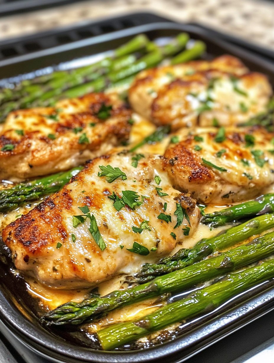 Spread asparagus on the bottom of a 3-quart casserole dish. Arrange chicken on top of asparagus, and pour the soup mixture over the top.