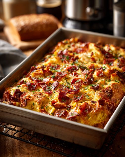 Oven-baked cheesy bacon and egg breakfast casserole is a comforting and hearty dish, perfect for leisurely weekend mornings or holiday gatherings with family and friends. This dish, with its roots in classic American breakfast fare, combines the savory flavors of crispy bacon with the creamy richness of eggs and cheese, all brought together by the subtle texture of bread. It’s a versatile dish that not only satisfies the palate but also can be prepared in advance, making it an excellent choice for those busy mornings when you want something homemade and delicious with minimal effort.